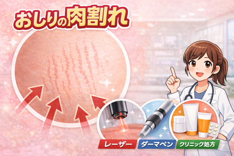 おしりの肉割れはセルフケアでも変化は期待できますが、「早く目立ちにくくしたい」というニーズには美容医療が選ばれる傾向があります。特に白くなった肉割れは、自宅ケアだけでは変化が出にくいとされているため、専門的なアプローチを組み合わせるケースが多いようです。ただし、効果・費用・回数のバランスを理解して選ぶことが大切です。