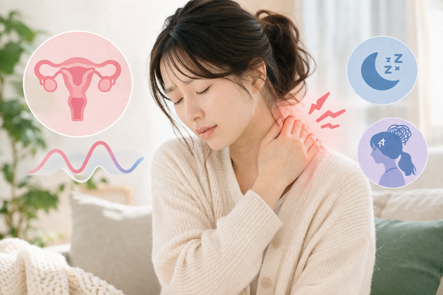単純な肩こりと切り分けるのは難しいですが、「なんとなく不調が続く」「時期によって悪化する」といった場合は、ホルモンの影響も視野に入れると整理しやすくなります。ホルモン変化と首の痛み