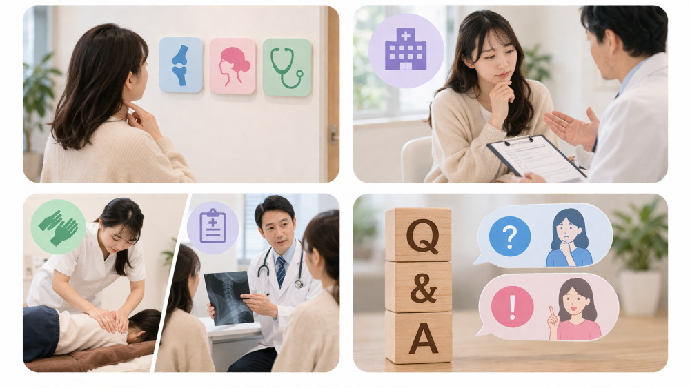 医療機関では原因の確認や検査が行われることが多く、状態の把握を目的とするケースが一般的とされています。一方で、整体や整骨院では筋肉やバランスに着目した施術が中心になると言われています。