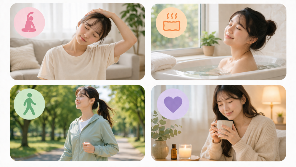 例えば、首や肩まわりを軽く動かすストレッチは、筋肉の緊張をゆるめるサポートになるとされています。また、蒸しタオルや入浴で温めることで血流が促され、コリの軽減につながることもあると言われています。
