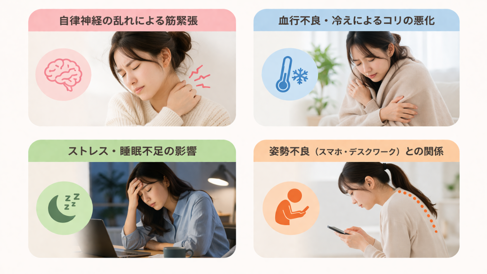 首の痛みは単純なコリだけでなく、自律神経・血流・生活習慣などが複雑に関係していると考えられています。特にホルモンバランスが乱れるタイミングでは、体の調整機能が崩れやすくなり、普段は気にならない負担が症状として出やすくなる傾向があります。