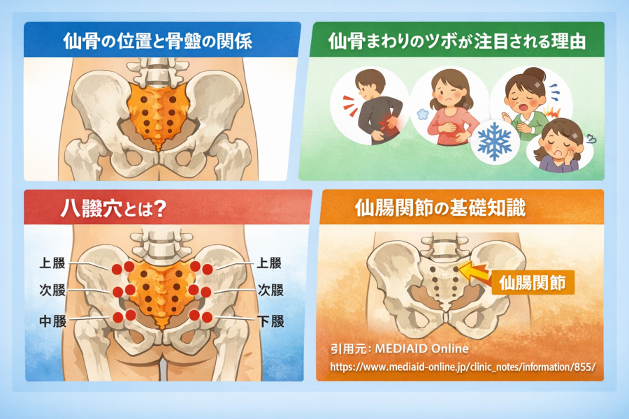 仙骨まわりのツボがよく注目されるのは、このあたりが腰と骨盤の境目に近く、座る、立つ、歩くといった毎日の動きで負担が集まりやすいからだと言われています。参考記事でも、仙骨と腸骨が合わさる仙腸関節は、上半身と下半身の間で衝撃を吸収する役割があると紹介されています。長く座ったあとに重だるさを感じたり、姿勢の崩れが気になったりすると、仙骨まわりを意識する人が多いのはこのためです。