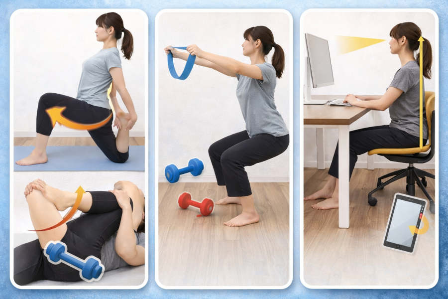 体の歪みを整えるうえで、体幹やお尻、背中の筋肉を使えるようにすることはとても重要だと言われています。これらの筋肉は姿勢を支える役割があるため、弱くなるとバランスが崩れやすくなります。ストレッチで整えた状態をキープするためにも、軽い筋トレを取り入れることが効果的とされています。とはいえ、強い負荷は必要なく、無理のない範囲で継続することが一番大切です。続けやすい方法を選ぶことが、結果的に改善につながりやすいと言われています。