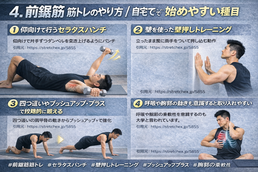 もうひとつ意識したいのが、呼吸や胸郭の動きです。参考記事では、前鋸筋は胸郭と肩甲骨の間にあり、猫背や胸まわりの動きとも関係しやすいと説明されています。つまり、前鋸筋 筋トレをするときも、胸を固めたまま力任せに行うより、息を吐きながら肩甲骨を前に送るほうが感覚をつかみやすいことがあります。うまく入らないときは、胸郭の広がりや背中の丸まりすぎにも目を向けるとよさそうです。筋トレというと負荷ばかり気になりがちですが、前鋸筋は動きの質を整える視点でも見ていきたい筋肉だと言われています。