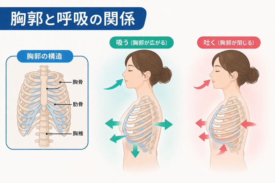 「なんで呼吸が浅いんだろう…」と感じたとき、多くの場合は胸郭の動きが関係していると言われています。