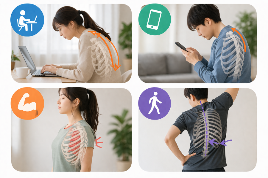 実は、胸郭の動きは“普段の姿勢・呼吸のクセ・体の使い方”にかなり左右されます。ここでは、よくある原因を一つずつ見ていきましょう。胸郭の動きと姿勢の問題