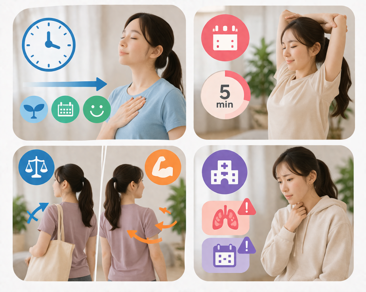 ストレッチや呼吸トレーニングを続けても改善が感じられない場合や、強い息苦しさがある場合は注意が必要です。特に日常生活でも違和感が続く場合は、内科や整形外科で体の状態を確認してもらうことがすすめられています。