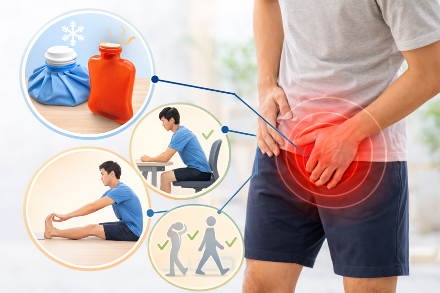 痛みが出ているときは、まず安静にするのが基本とされています。さらに、炎症っぽい痛み(ズキズキ・熱感)がある場合は冷やす、慢性的な張り感であれば温めるのがよいと言われています。