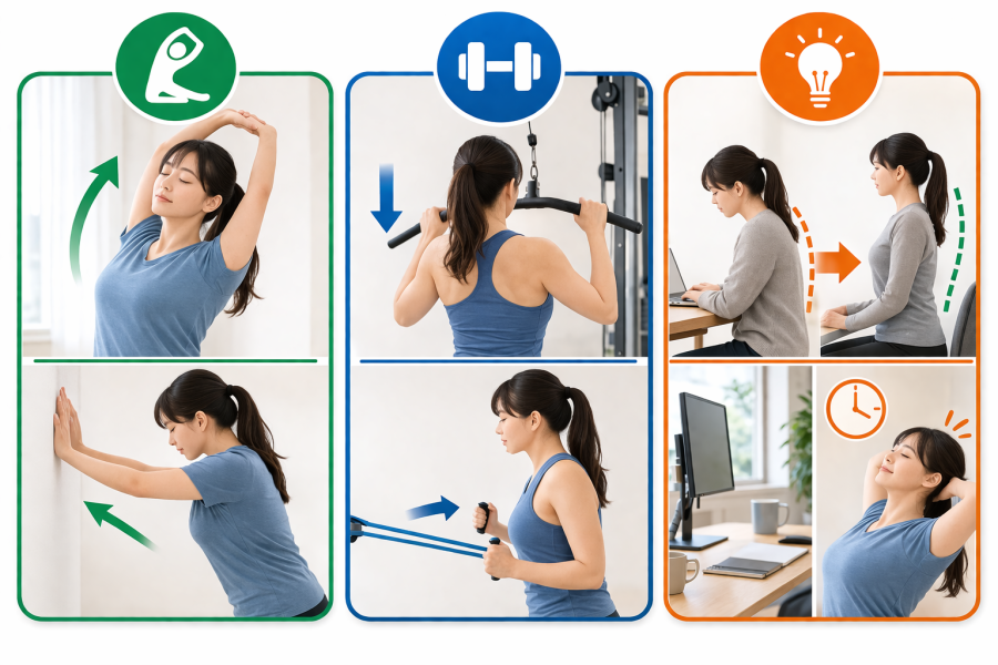 ここが一番気になりますよね。広背筋は“硬さ”と“弱さ”の両方が姿勢に影響すると言われているため、ストレッチとトレーニングをバランスよく取り入れることが大切とされています。さらに、日常の習慣も組み合わせることで、より安定した姿勢につながると考えられています。