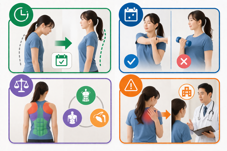 また、一時的に良くなっても、元の生活に戻ると姿勢も戻りやすい傾向があると言われています。そのため、ストレッチや筋トレを習慣化することが、安定した姿勢につながるポイントとされています。