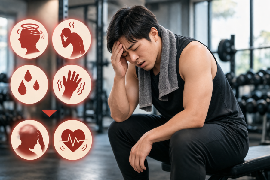 筋トレ中はエネルギー消費が大きいため、血糖値が急に下がると体にさまざまな異変が出やすいと考えられています。軽い違和感で済む場合もありますが、放置すると悪化するケースもあるため注意が必要です。