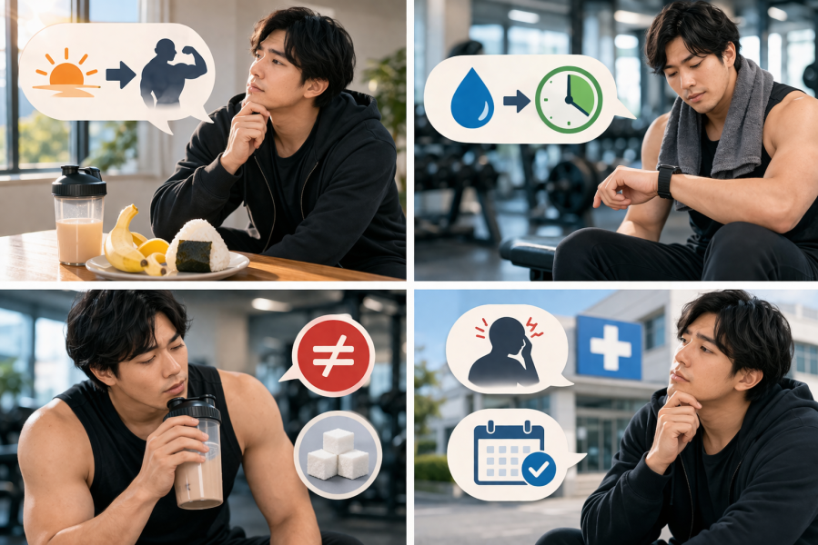 そこでこのパートでは、筋トレと低血糖に関するよくある疑問をわかりやすく整理していきます。実際に多い質問なので、ひとつずつ確認しておきましょう。フィットネスと回復のアイコン展示
