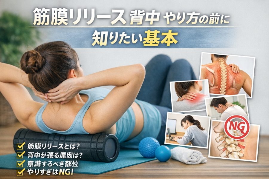 筋膜リリース 背中 やり方をわかりやすく解説。フォームローラーを使う方法から道具なしのセルフケア、肩甲骨まわり・胸椎・広背筋への当て方、やりすぎを防ぐ注意点まで紹介します。背中のこりや張りが気になる人が自宅で始めやすい内容です。