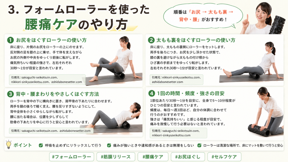 筋膜リリース 腰痛 ローラーでセルフケアしたい方へ。フォームローラーで腰痛対策を行うときの基本、ほぐすべきお尻・太もも裏・背中まわり、やり方、避けたい使い方、痛みが悪化する場合の受診目安までわかりやすく解説します。