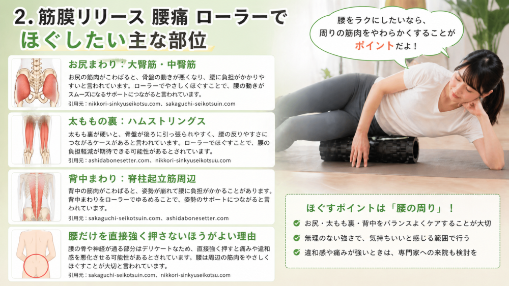2. 筋膜リリース 腰痛 ローラーでほぐしたい主な部位