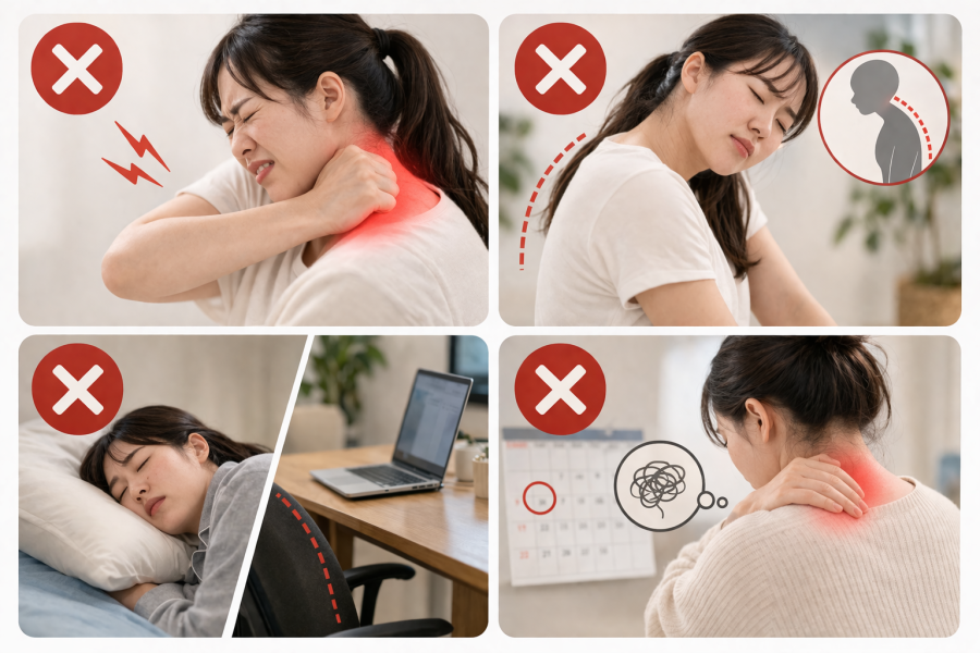 とくに無意識で続けている行動が、筋肉の緊張を強めていることも少なくないと言われています。ここでは、見落としがちなNG習慣を整理していきます。不適切な姿勢と習慣の警告