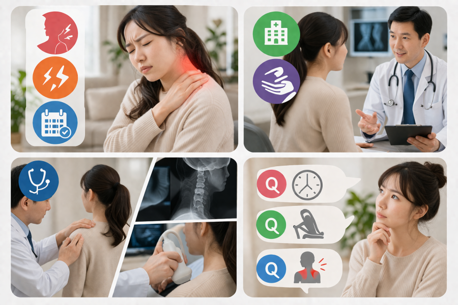 例えば、肩と首の間の筋肉の痛みに加えて「しびれ」が出ている場合、神経が関係している可能性があると考えられています。また、日常生活に支障が出るほどの強い痛みや、数週間以上続いても改善の変化が見られないケースも注意が必要とされています。