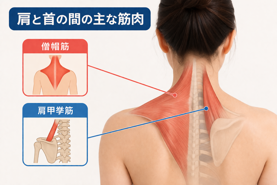 1:肩と首の間にある主な筋肉(僧帽筋・肩甲挙筋)
