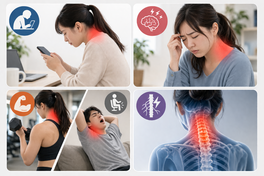 とくに現代はスマホやパソコンの使用時間が長く、筋肉に負担がかかりやすい環境とも言われています。ここでは、よくある原因を順番に見ていきましょう。首・肩の痛みの原因