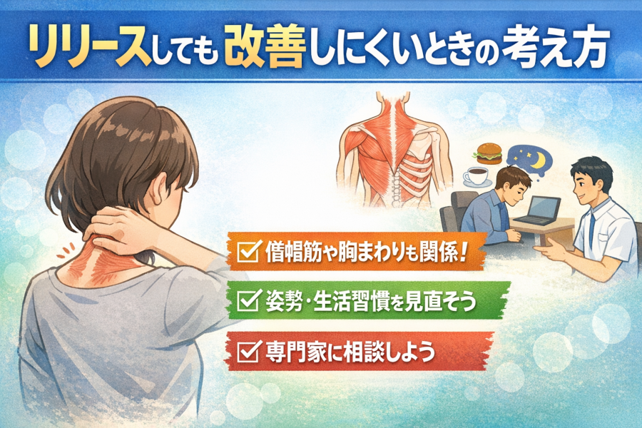 そのため、肩甲挙筋リリースだけに頼るのではなく、姿勢や生活習慣も含めて見直していくことが大切と言われています。無理なく続けていてもつらさが残るときは、別の部位や原因を視野に入れる考え方が必要になりそうです。
