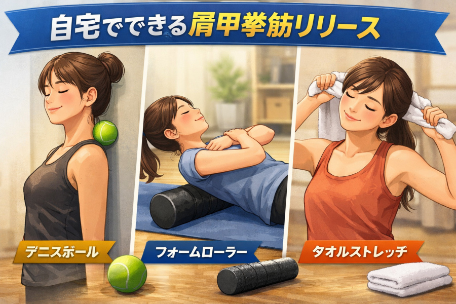 be33c629-4732-4f2e-88a6-0b9e68abf65b「肩甲挙筋リリースって、自分でもできるの?」と思いますよね。参考記事では、特別な機械がなくても、テニスボールやフォームローラー、タオルなど身近なものを使ってセルフケアしやすいと紹介されています。ポイントは、首の付け根から肩の内側にかけての張りやすい部分を見つけて、強く押しつぶすのではなく、やさしく圧をかけながら呼吸を止めずに行うことだと言われています。いきなり長時間やるよりも、短い時間で様子を見ながら進めるほうが続けやすいようです。