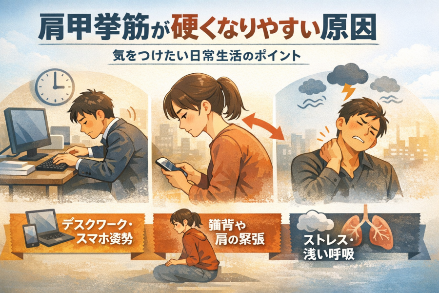 参考記事では、デスクワークで前かがみの姿勢が続いたり、スマホを見るときに下を向き続けたりすると、肩甲骨が下に引っ張られ、肩甲挙筋に負担がかかりやすくなると説明されています。その状態で首の位置が固定されると、筋肉は引き伸ばされたまま働き続けるため、疲労や緊張につながると言われています。