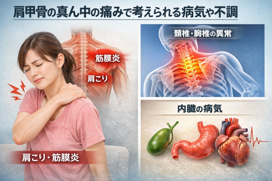 もうひとつ知っておきたいのが、内臓の不調が肩甲骨の真ん中付近の痛みとしてあらわれることがある、という点です。これは関連痛と呼ばれ、痛みの原因が背中そのものではない場合もあると言われています。参考記事でも、心筋梗塞や胆石症などが例として挙げられていますし、医療情報でも胆のうの不調では肩甲骨の間の背部痛がみられることがあるとされています。さらに、肩や肩甲骨まわりの痛みが、心疾患や胆のうの病気など胸部・腹部の不調に由来することもあるようです。息苦しさ、吐き気、冷や汗、強い胸の圧迫感などを伴うときは、様子を見すぎず早めに来院先を考えることが大切だと言われています。