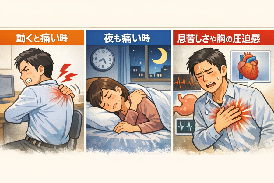 肩甲骨の真ん中が痛いときでも、息苦しさや胸の圧迫感、吐き気、冷や汗などを伴う場合は、背中の筋肉だけの問題とは限らないと言われています。参考記事でも、心筋梗塞や胆石症などの内臓由来の関連痛が例として挙げられています。さらに医療情報でも、胸の締めつけ感、呼吸のしづらさ、吐き気、背中への放散痛は心臓由来の症状としてみられることがあるとされています。そのため、「背中が痛いだけ」と決めつけず、いつもと違う強い不快感があるときは、早めに来院先を考えることが大切だと言われています。