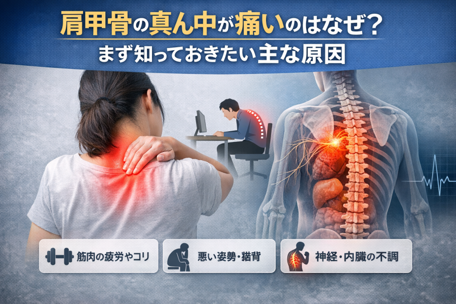 肩甲骨の真ん中が痛いと感じるときは、姿勢の乱れや筋肉の緊張だけでなく、神経や内臓の不調が関係することもあります。考えられる原因、痛みの特徴、自宅でできる対処法、病院へ行く目安までわかりやすく解説します。