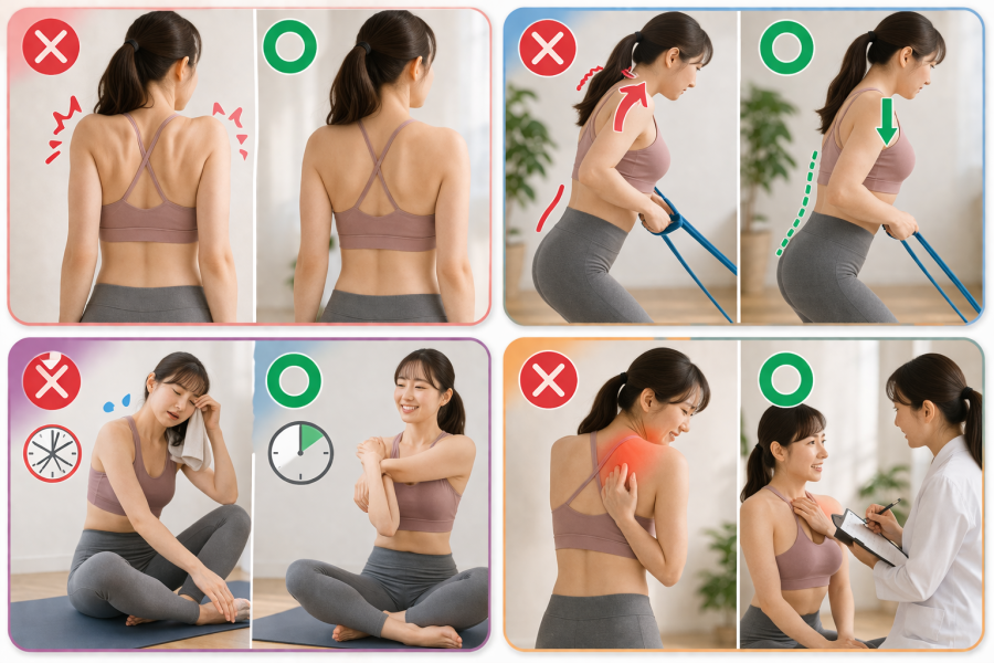 肩や背中に痛みがある状態で無理にストレッチやトレーニングを行うと、筋肉や関節に負担がかかる可能性があります。特に鋭い痛みや違和感がある場合は、一度動きを控える判断も必要とされています。