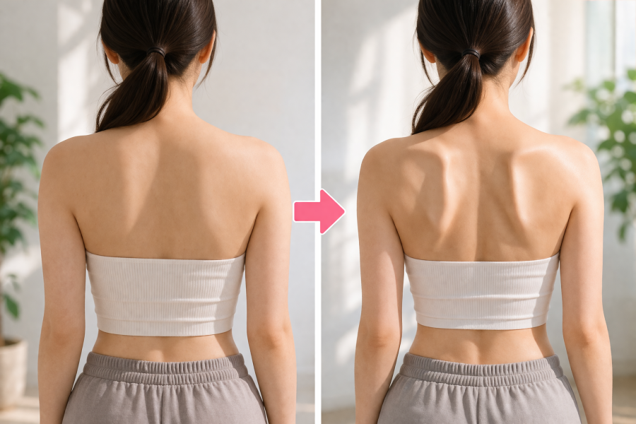 背中に脂肪が多い場合、肩甲骨の輪郭が隠れてしまい、実際には動いていても見えづらいことがあります。見た目に影響する部分なので、「出ていない」と感じる原因になりやすいです。