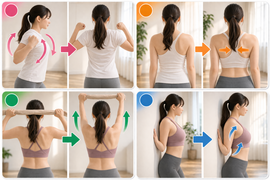 最初に取り入れたいのが肩回しと肩甲骨寄せです。肩回しは、腕を大きく回して肩甲骨ごと動かすイメージで行うのがポイントになります。小さく回すよりも、背中から動かす意識の方が可動域が広がりやすいと言われています。