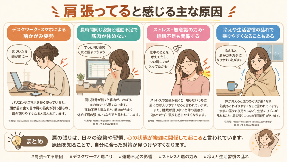 「肩 張ってる感じがするけど、何が原因なんだろう…」と気になること、ありますよね。実はその感覚は、ひとつの理由だけで起こるというより、毎日の姿勢や生活リズムが重なって出やすくなると言われています。日本整形外科学会では、肩まわりの張りやこりにつながる要因として、前かがみ姿勢、運動不足、精神的なストレス、長時間同じ姿勢を続けること、冷房などを挙げています。参考記事でも、肩の張りは筋肉の緊張が続いているサインのひとつとされています。つまり、「特別なことをしたから急に起きた」というより、ふだんの積み重ねが関係していることもあるようです。仕事中の座り方、スマホを見る角度、休憩の少なさ、寝不足、体の冷えなど、身近なことが肩の張りにつながっていると言われています。だからこそ、肩だけを気にするのではなく、「最近の生活どうだったかな」と振り返ってみる視点が大切になりそうです。