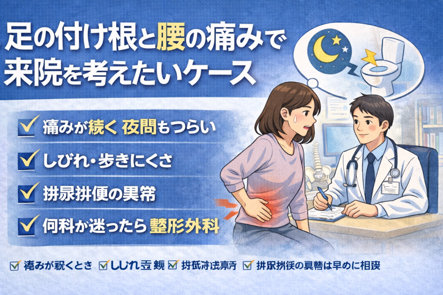 どこに相談すればよいか迷うときは、まず整形外科が選択肢になりやすいと言われています。足の付け根と腰の痛みは、股関節、腰椎、骨盤まわりなど整形外科の領域と関係することが多いためです。もちろん、症状によっては別の科につながることもありますが、最初の相談先として考えやすいようです。