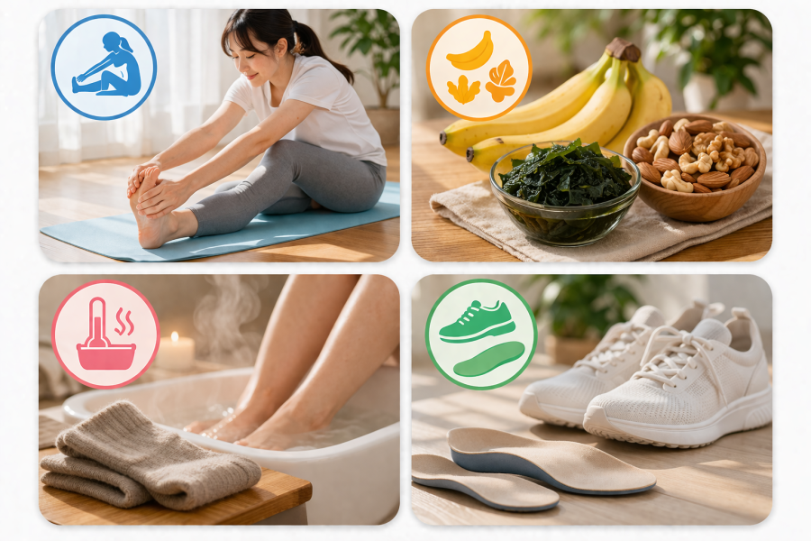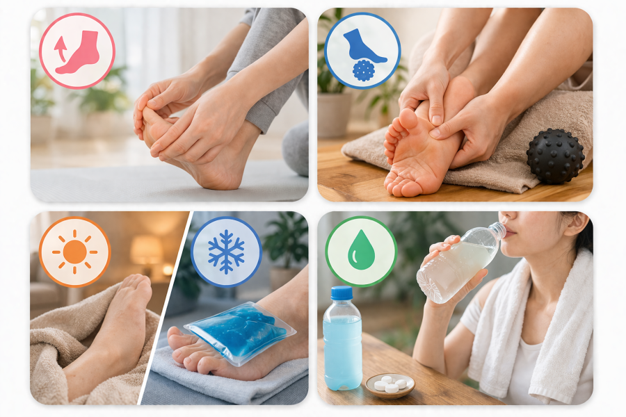 足の指がつったときは、無理に動かしたり我慢したりするよりも、正しい順番でケアすることが大切とされています。ポイントは「伸ばす・ほぐす・整える」の3ステップです。