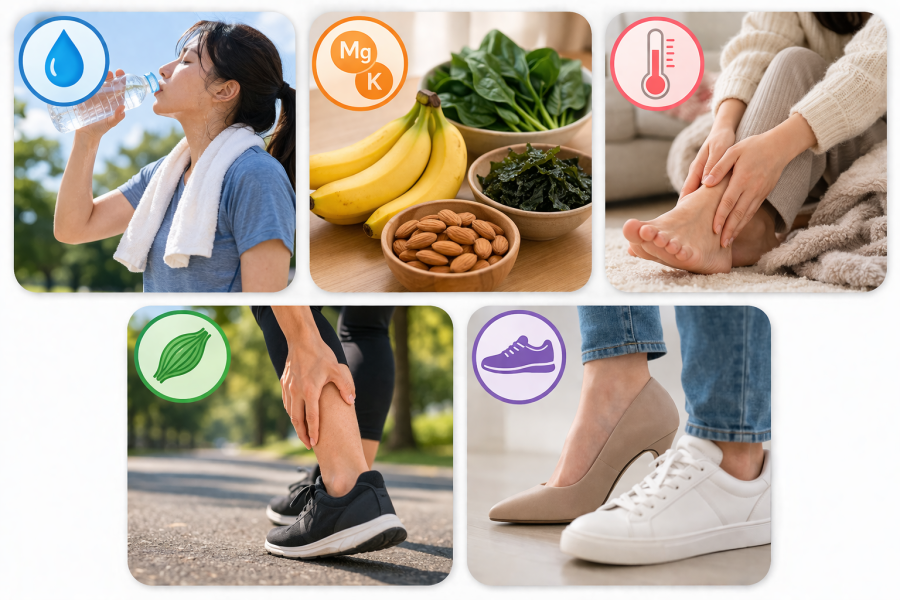 足の指がつる原因はひとつではなく、いくつかの要因が重なって起こると言われています。特に多いのが、水分・ミネラル・血流・筋肉・生活習慣の5つです。どれか一つでも崩れると、筋肉がうまくコントロールできず、ピクッと異常な収縮が起きやすくなると考えられています。