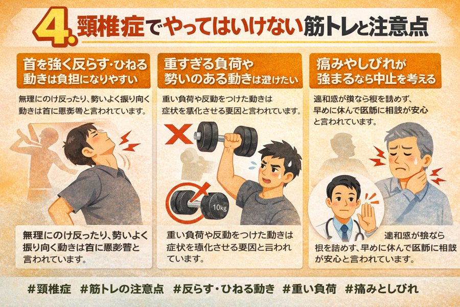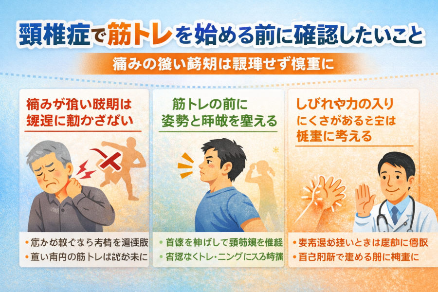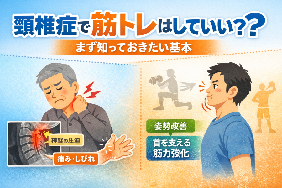 頚椎症 筋トレが気になる方へ。首や肩まわりに負担をかけにくい運動の考え方、自宅で取り入れやすい筋トレ・ストレッチ、やってはいけない動作、痛みやしびれがあるときの受診目安までわかりやすく解説します。