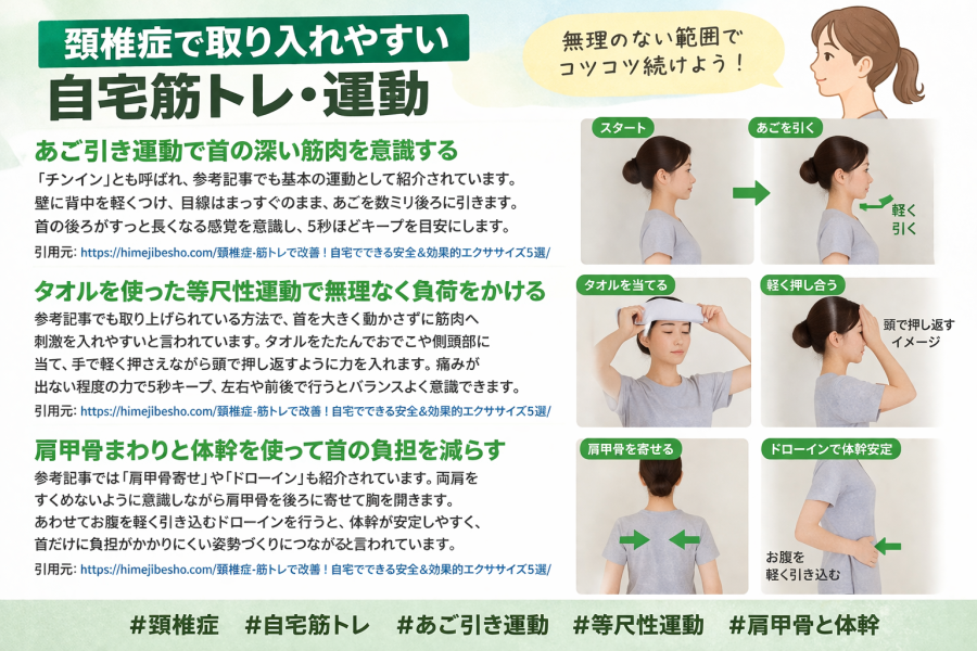 では、頚椎症で筋トレが注目されるのはなぜでしょうか。ここでいう筋トレは、重い負荷をかける運動ではなく、あご引きや肩甲骨まわり、体幹を意識した軽めの運動を指すことが多いです。参考記事でも、首の深い筋肉や肩甲骨まわりを整える運動が紹介されていますし、海外の整形外科情報でも、保存的な方法として理学療法や具体的な運動が用いられ、弱った筋肉を強くしたり、硬い筋肉を伸ばしたりすることが役立つと言われています。無理なく続けられる範囲で行うことが、頚椎症と筋トレを考えるうえでの基本になりそうです。