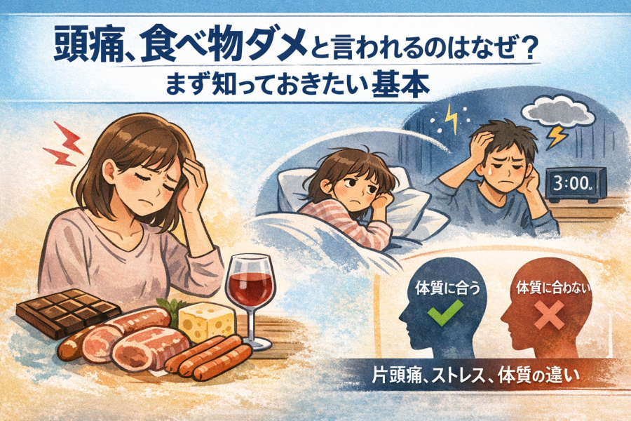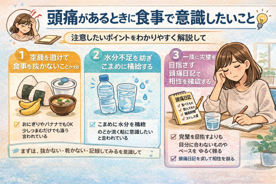 3197bb92-16a3-4bfc-a9a4-a30d5da4a331頭痛があるとき、「何を食べないか」ばかり気にしてしまう方は多いです。ですが、実際には避けることだけでなく、食べ方や水分のとり方を整えることも大切だと言われています。参考記事でも、頭痛を悪化させやすい食品に注意しつつ、食事の抜きすぎや生活リズムの乱れにも目を向けることがすすめられています。MSDマニュアルでも、片頭痛の誘因として食事を抜くことが挙げられており、空腹そのものが負担になる場合があるようです。また、日本頭痛学会の頭痛ダイアリーでは、頭痛の強さだけでなく誘因やメモも残せる形になっていて、自分の傾向を見つける助けになることがうかがえます。頭痛がつらい日は、完璧な食事管理を目指すよりも、まずは「抜かない」「乾かさない」「記録してみる」の3つを意識すると取り入れやすいです。引用元:https://www.nikkori-sinkyuseikotsu.com/archives/7551.html