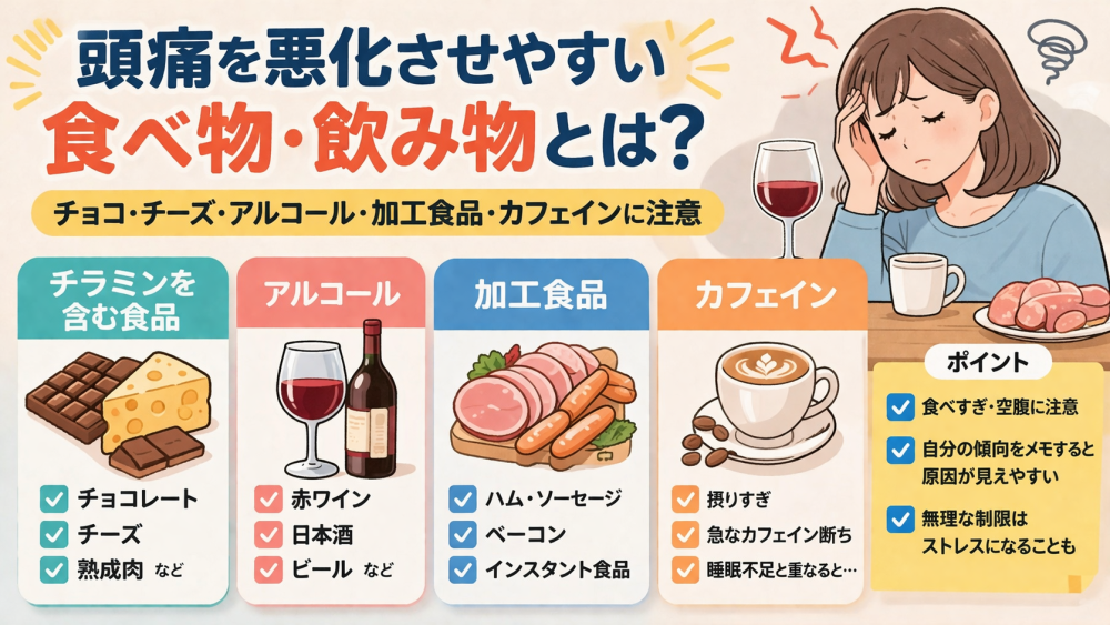 3348a8bf-2ffa-4c21-b8ee-474eb9c1d150「頭痛 食べ物 ダメ」で調べると、いろいろな食品が出てきて迷いますよね。実際、頭痛を悪化させやすいといわれる食べ物や飲み物はいくつかあります。参考記事でも、チョコレートやチーズ、赤ワイン、加工食品、カフェインなどが挙げられています。ただ、ここで大切なのは、全部の人に同じように当てはまるわけではないという点です。日本頭痛学会でも、赤ワインやチョコレート、チーズは片頭痛の誘因としてよく知られている一方で、食品による影響には個人差が大きいとされています。つまり、「これを食べたら必ず悪化する」と決めつけるより、自分に合わないものを落ち着いて見つけていく考え方が大切だと言われています。参考記事の内容をベースにしつつ、まずは代表的な食品を順番に見ていきましょう。
