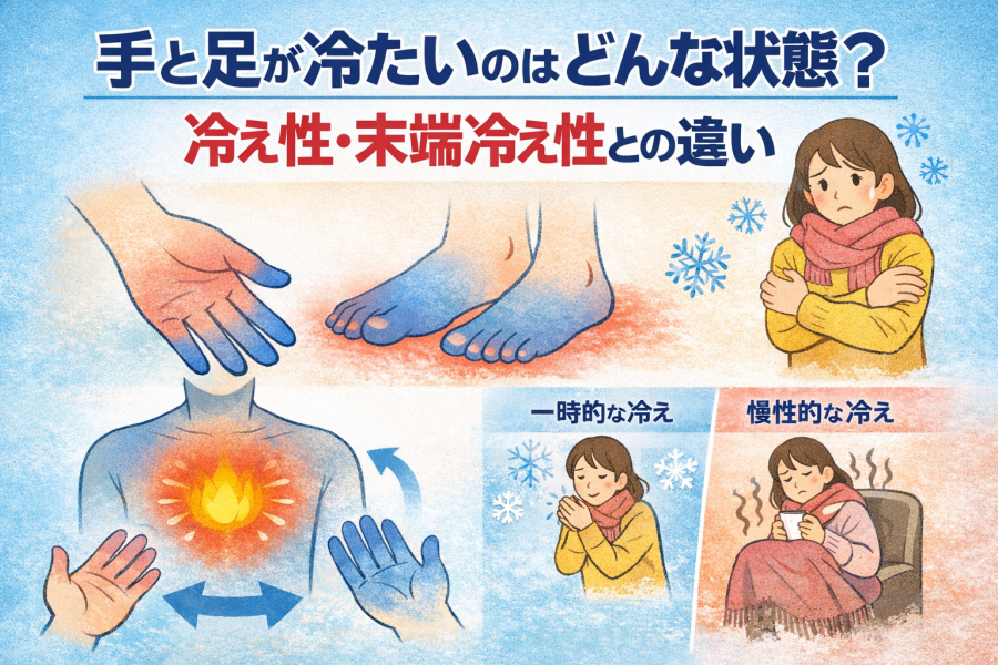 手と足が冷たいと感じるときは、血流や自律神経、筋肉量、生活習慣の影響だけでなく、病気が隠れていることもあります。冷え性との違い、主な原因、今日からできる対策、来院を考えたいサインまでわかりやすく解説します。